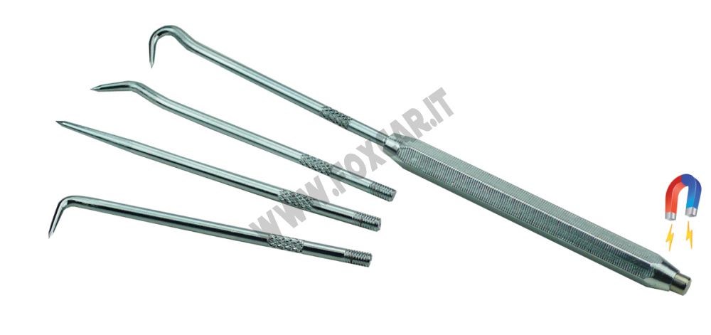 Set di attrezzi per lo smontaggio degli o-ring e dei paraolio con 4 punte intercambiabili e manico con magnete. Un kit di attrezzi molto utile anche per la pulizia delle cave dei gommini, degli ugelli ecc.