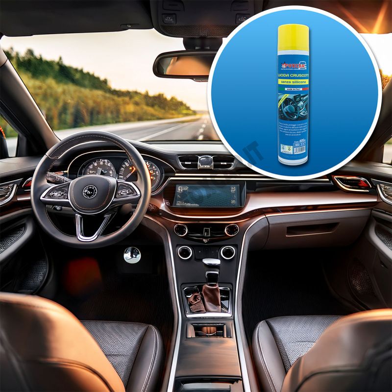 Bomboletta spray lucida cruscotti senza silicone da 600 ml, ideale per pulire, lucidare e proteggere il cruscotto e tutte le superfici in plastica interne dell’auto. La sua formula specifica aiuta a rimuovere sporco e polvere, lasciando le superfici protette dagli agenti atmosferici e dai raggi UV, senza lasciare residui siliconici.