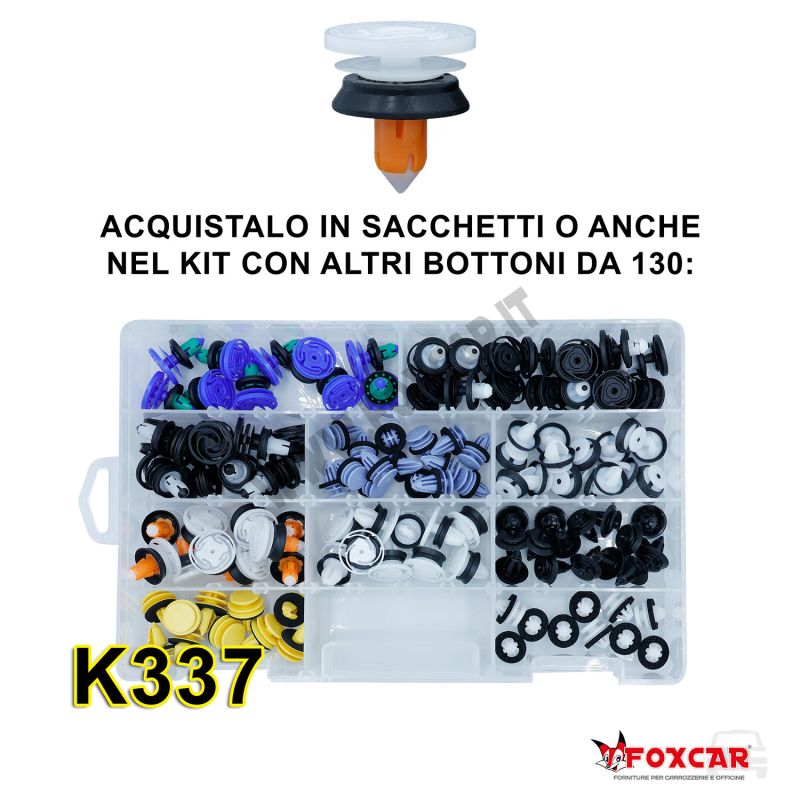Puoi acquistare questo bottone in sacchetti o anche nel K337: Kit di 130 bottoni fermapannello.