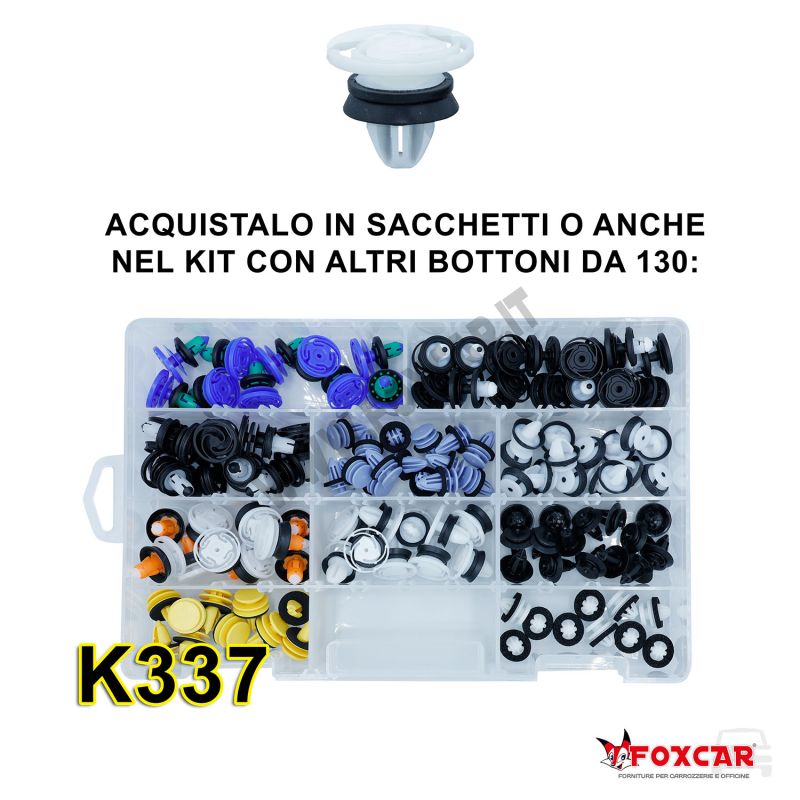Puoi acquistare questo bottone in sacchetti o anche nel K337: Kit di 130 bottoni fermapannello.