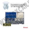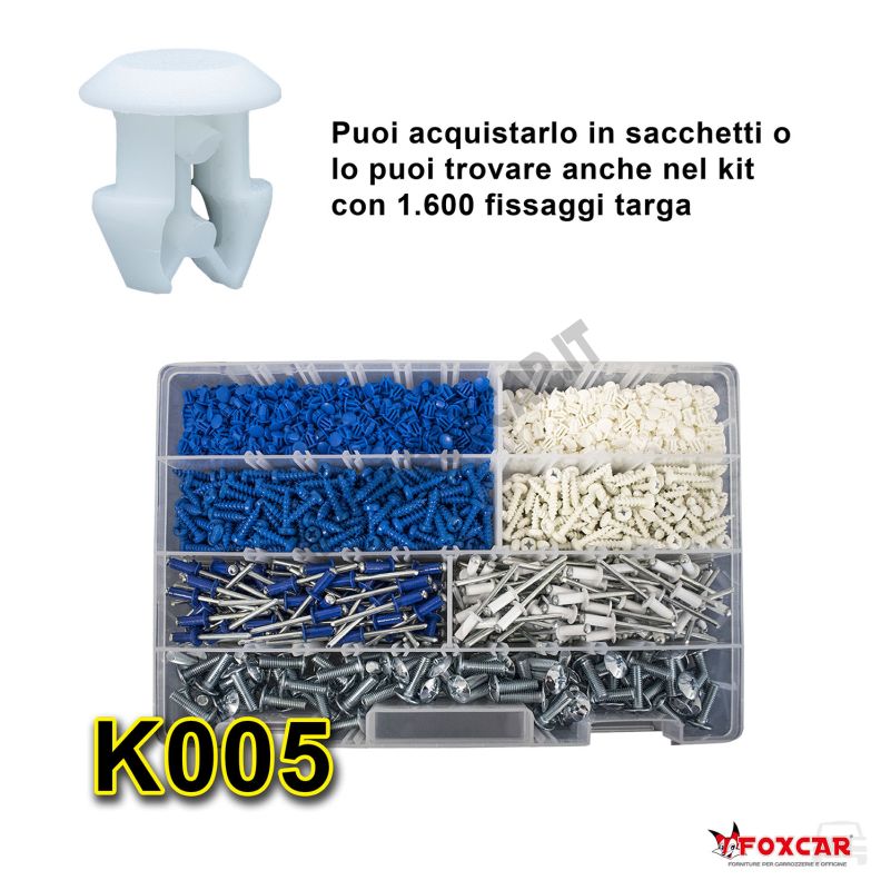 Confezione da 100 bottoni in plastica di colore bianco, ideali per il fissaggio della targa di immatricolazione su auto, furgoni, camper, moto, quad e scooter. La particolare forma a coda di rondine consente un aggancio semplice e stabile al supporto targhe, contribuendo a mantenere la targa ben fissata e a ridurre le vibrazioni durante la marcia.