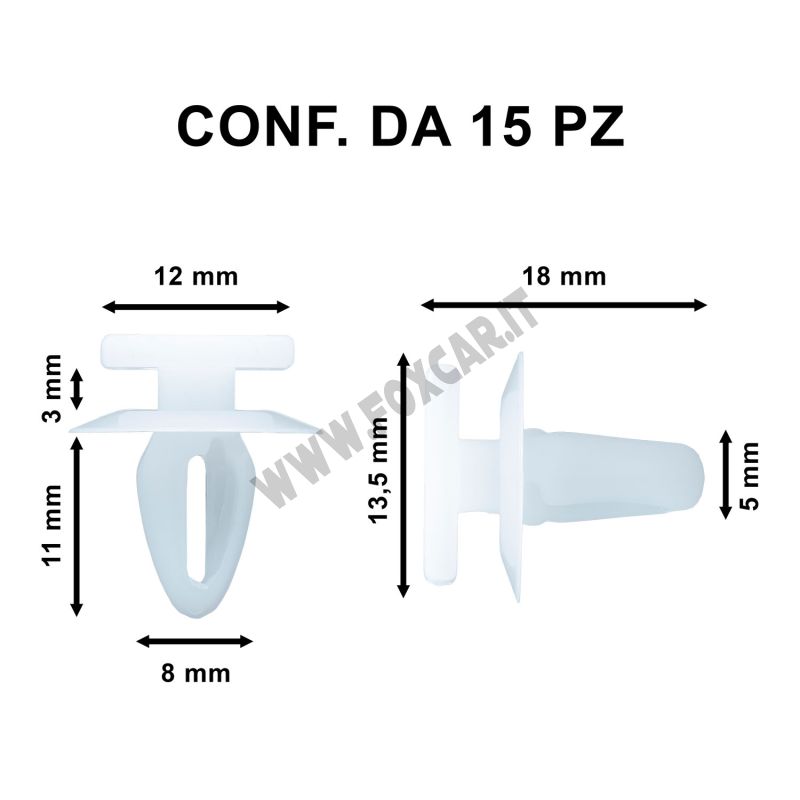 Fermapannello per applicazioni su modanature, listelli e rivestimenti auto, realizzato in nylon poliammide PA6. Questo componente è indicato per diversi modelli Hyundai e Mitsubishi nelle applicazioni riportate, risultando adatto per interventi di fissaggio su finiture esterne e interne del veicolo.
