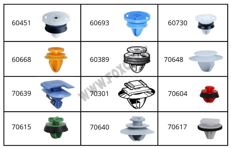Assortimento di 260 graffe in plastica per il fissaggio del pannello porta e della modanatura esterne su autovetture di nuova generazione marchio: Peugeot, Citroen e Renault.