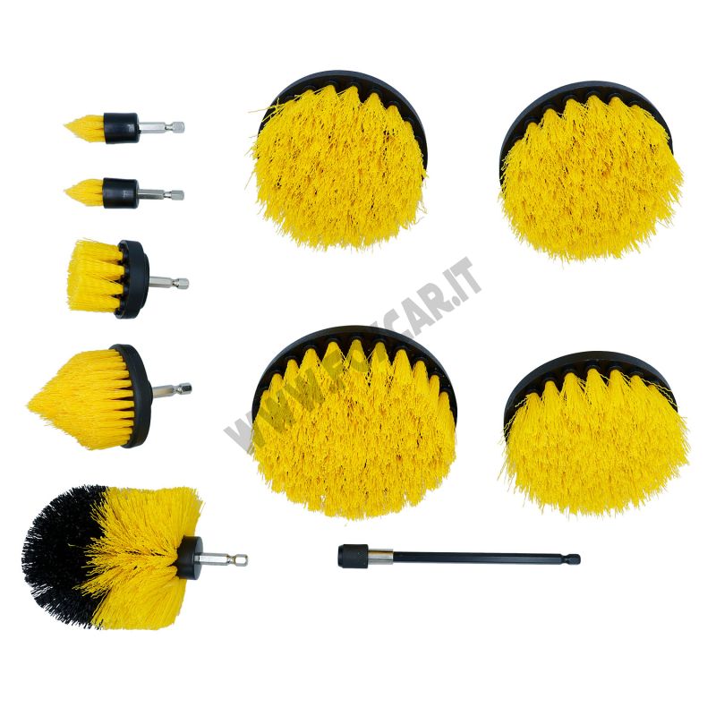 Kit di spazzole per trapano da 10 pezzi, ideale per la pulizia profonda di superfici difficili sia in ambito domestico che automotive, come per esempio i cerchi in lega. Le varie forme e dimensioni delle spazzole permettono di rimuovere efficacemente sporco, incrostazioni e residui da cerchi, tappeti, rivestimenti, fughe, superfici dure e angoli difficili da raggiungere.