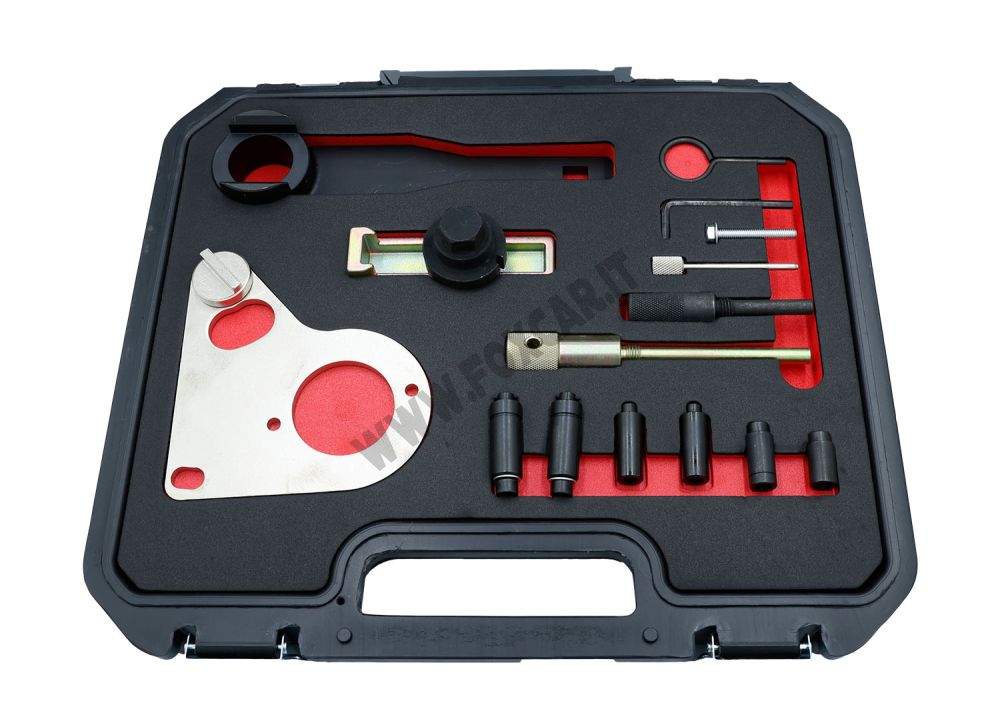 Set professionale per la fasatura dei motori Diesel common-rail Renault, Opel/Vauxhall e Nissan nelle cilindrate 1.6, 2.0 e 2.3 dCi/CDTi. Progettato per bloccare e allineare con precisione alberi a camme, albero motore e ingranaggi durante la sostituzione della catena di distribuzione o altri interventi sul gruppo termico, riducendo tempi di lavorazione e rischio di errori.