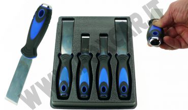 Kit di quattro scalpelli di diverse misure e spessori con lama in corpo unico, che permettono di essere utilizzati anche come scalpelli.