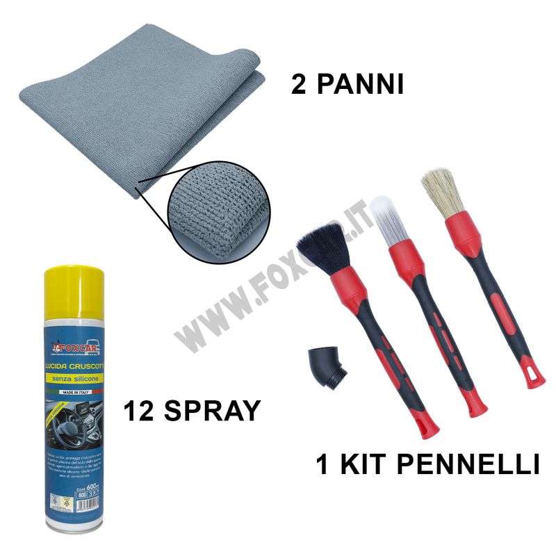 1 kit di 3 pennelli per pulizia auto + 2 panni nuvola 52x44cm + 12 spray lucida cruscotti senza silicone
