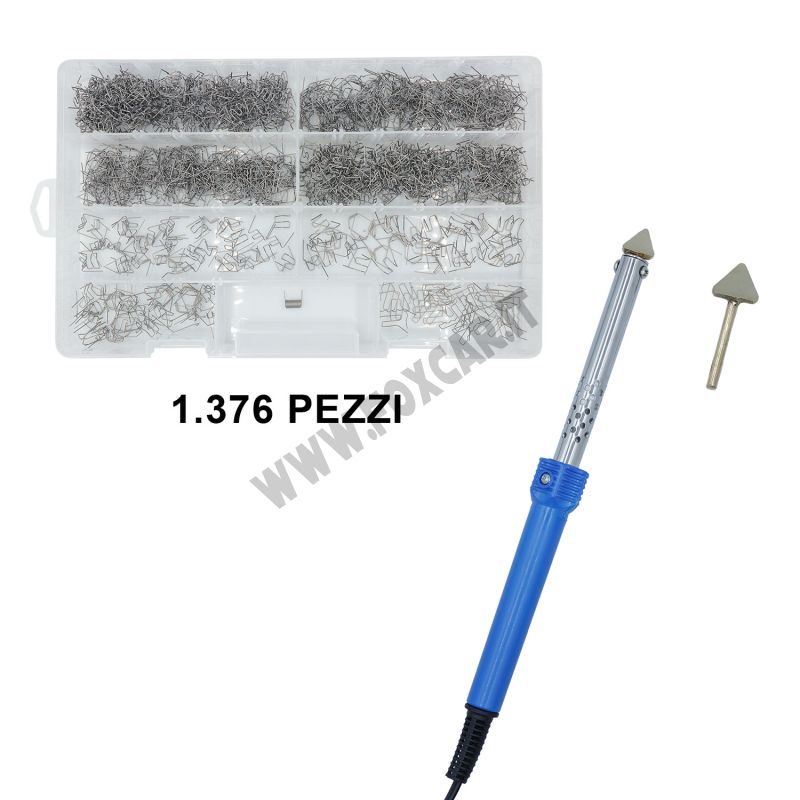 Kit assortito di graffette in acciaio sagomato per la riparazione e il rinforzo di plastiche (es. paraurti e supporti fari). Le diverse forme permettono di intervenire su parti piane, angoli interni/esterni e zone soggette a sollecitazioni, creando un’armatura resistente e duratura quando la graffetta viene annegata nella plastica.