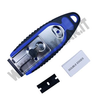 Raschietto per la rimozione di adesivi compreso di 6 lame in plastica da 40 mm.