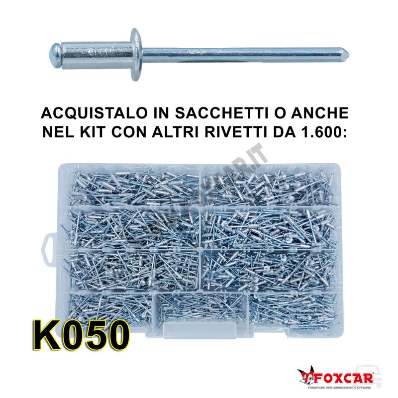 Puoi acquistare questo rivetto in sacchetti o anche nel K050: Kit di 1600 rivetti a strappo in alluminio, in diverse misure e diametri