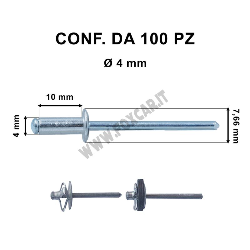 Set da 100 rivetti a strappo in alluminio con misure 4 x 10 mm e foro Ø 4 mm, pensati per fissaggi pratici quando servono dimensioni definite e una scorta comoda per più lavorazioni. Ideali per assemblaggi e interventi di riparazione che richiedono una foratura coerente con il diametro indicato.