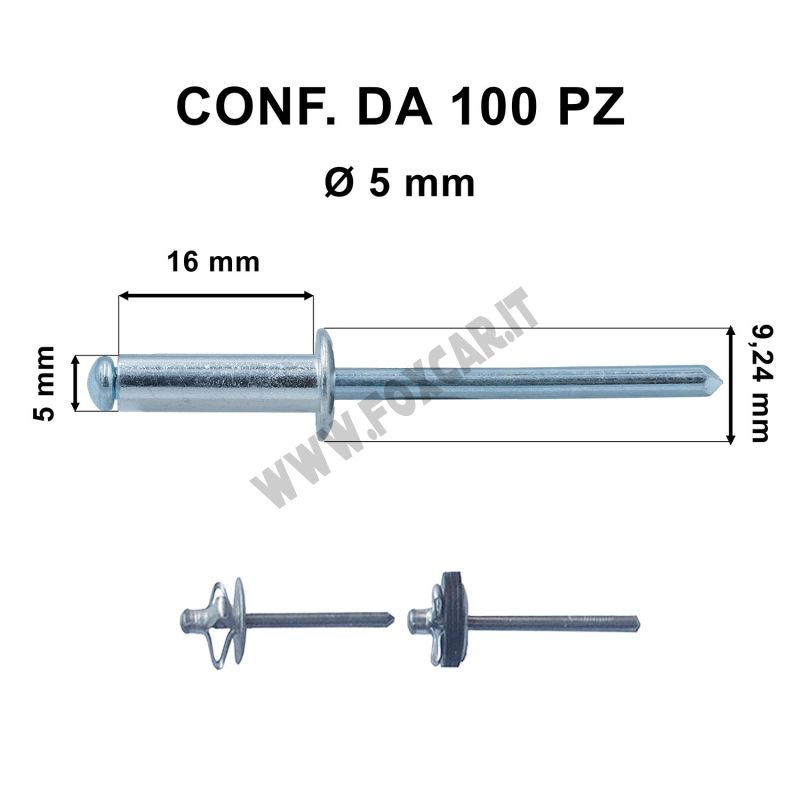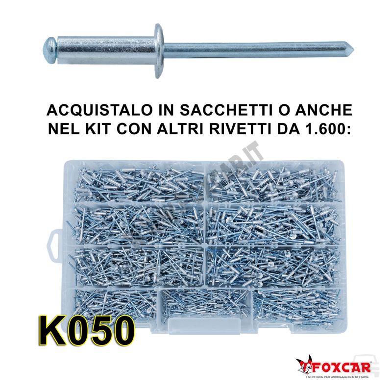 Puoi acquistare questo rivetto in sacchetti o anche nel K050: Kit di 1600 rivetti a strappo in alluminio, in diverse misure e diametri
