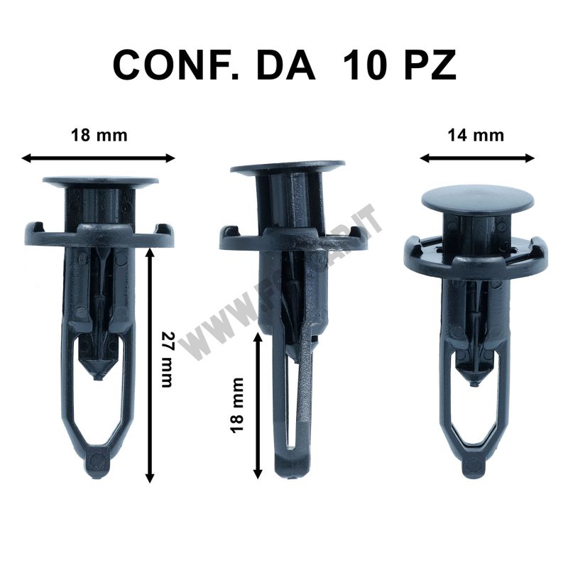 Confezione di 10 bottoni rivetti in plastica con gambo ad espansione e perno a testa larga ad incastro per fissare le mascherine radiatore e plastiche di protezione vano motore su Toyota vari modelli. Codice intercambiabile Toyota 5216102030 5216116010.