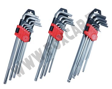 Tre serie da 27 chiavi a L extra lunghe esagonali, torx e torx con foro.