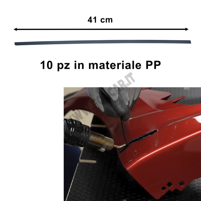 I listelli in polipropilene vengono utilizzati come materiale d’apporto durante la saldatura a caldo delle plastiche. Impostata la temperatura corretta sulla stazione saldante, si riscaldano contemporaneamente la parte danneggiata e il listello, facendo fondere il materiale in modo uniforme. Il listello viene steso lungo la zona da riparare per riempire crepe, rotture o mancanze di materiale. Una volta raffreddato, l’eccesso può essere carteggiato e rifinito in vista dell’eventuale verniciatura.