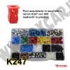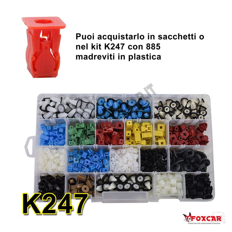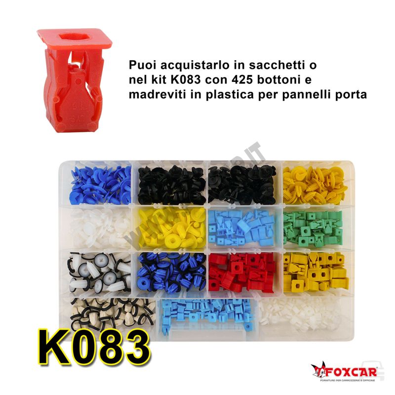 - Applicazioni: fissaggio di rivestimenti e ripari, mascherine, prese aria, parasassi, pannelli porta e bagagliaio; utilizzabile anche per pannelli insonorizzanti o rivestimenti su macchinari, elettrodomestici e mobili.